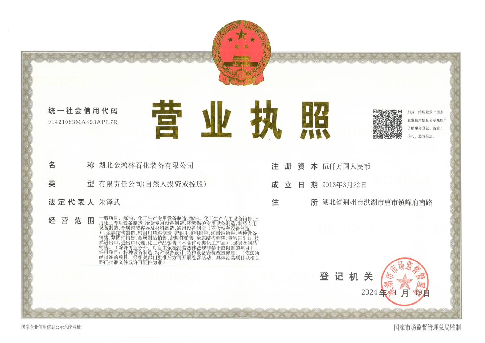 湖北金鸿林石化装备有限公司位于具有“鱼米之乡”、“水泽之国”美称的洪湖经济开发区,注册资本5000万元。专业从事一、二、三类压力容器、塔内件、塔填料、储罐及管道附件的设计、制造和安装,具有湖北省市场监督管理局颁发的A2级设计、制造、安装许可证书,并通过了ISO9001:2015标准质量管理体系、ISO45001:2018标准职业健康安全管理体系、ISO14001:2015标准环境管理体系的认证,是中石化、中石油一级供应(网络)企业。