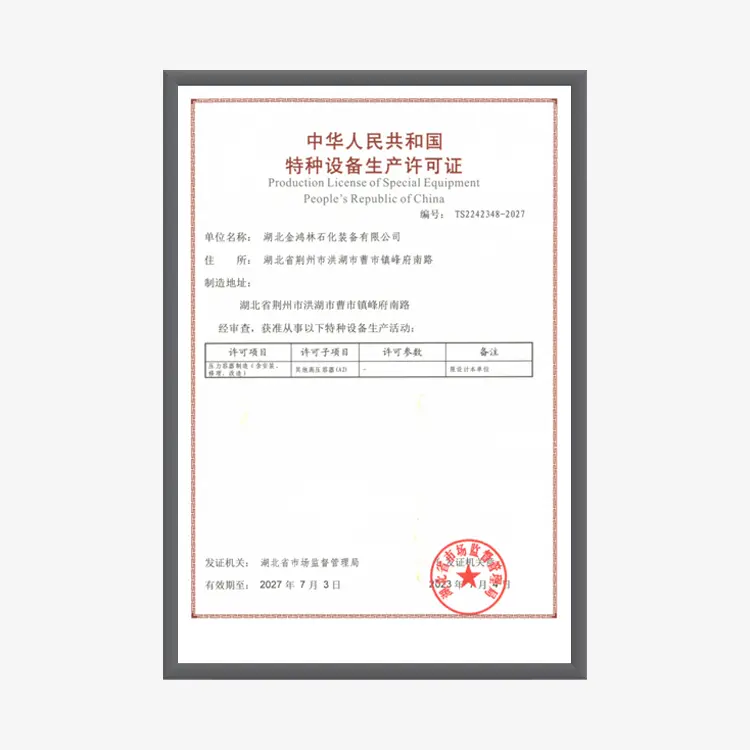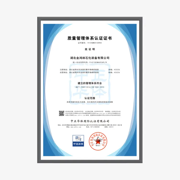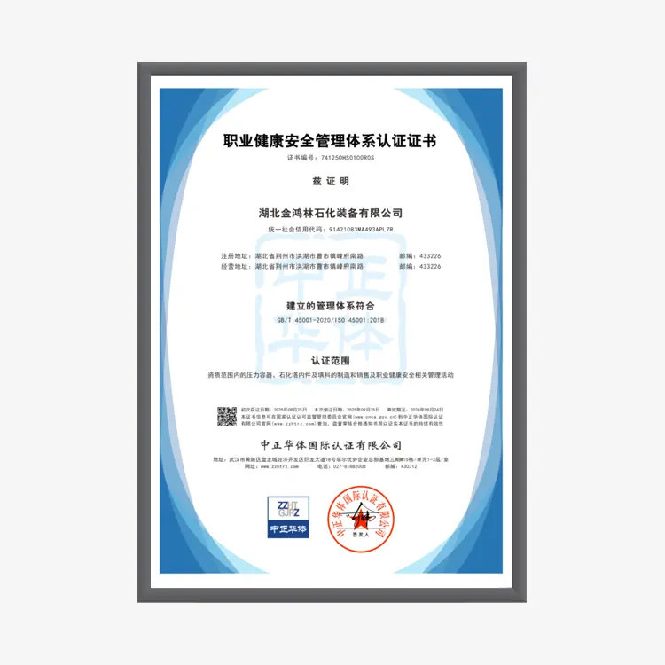 湖北金鸿林石化装备有限公司位于具有“鱼米之乡”、“水泽之国”美称的洪湖经济开发区,注册资本5000万元。专业从事一、二、三类压力容器、塔内件、塔填料、储罐及管道附件的设计、制造和安装,具有湖北省市场监督管理局颁发的A2级设计、制造、安装许可证书,并通过了ISO9001:2015标准质量管理体系、ISO45001:2018标准职业健康安全管理体系、ISO14001:2015标准环境管理体系的认证,是中石化、中石油一级供应(网络)企业。
